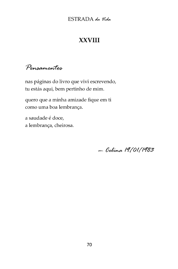 Nesta coletânea, cada poema representa um fragmento da estrada que todos percorremos — marcada por saudade, fé, amizade, gratidão e busca pelo amor. A obra também se constrói como um legado familiar, nascido da partilha entre mãe, filhos e netos, preservando a voz de uma mulher cuja poesia brota da alma e do cotidiano.